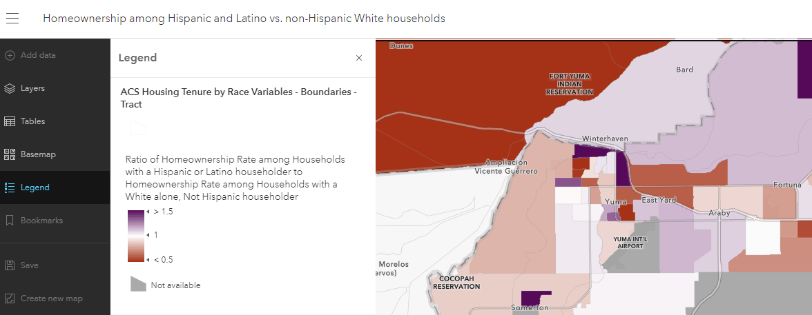 Here I have a map comparing homeownership rates between two groups: non-Hispanic White vs. Hispanic and Latino. This map uses the Compare A to B mapping style, great for comparing two attributes, as it shows one value as a ratio of the other. This is one of many ways to show differences among groups in your maps.