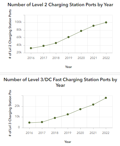 Across the U.S., there has been a steady increase of level 2 and level 3 (DCFC) charging stations from 36,942 charging ports in 2016 to 128,431 in 2022, an overall increase of 91,489 Level 2 & 3 (DCFC) charging station ports. While this number has gone up significantly, so has the demand of EVs.