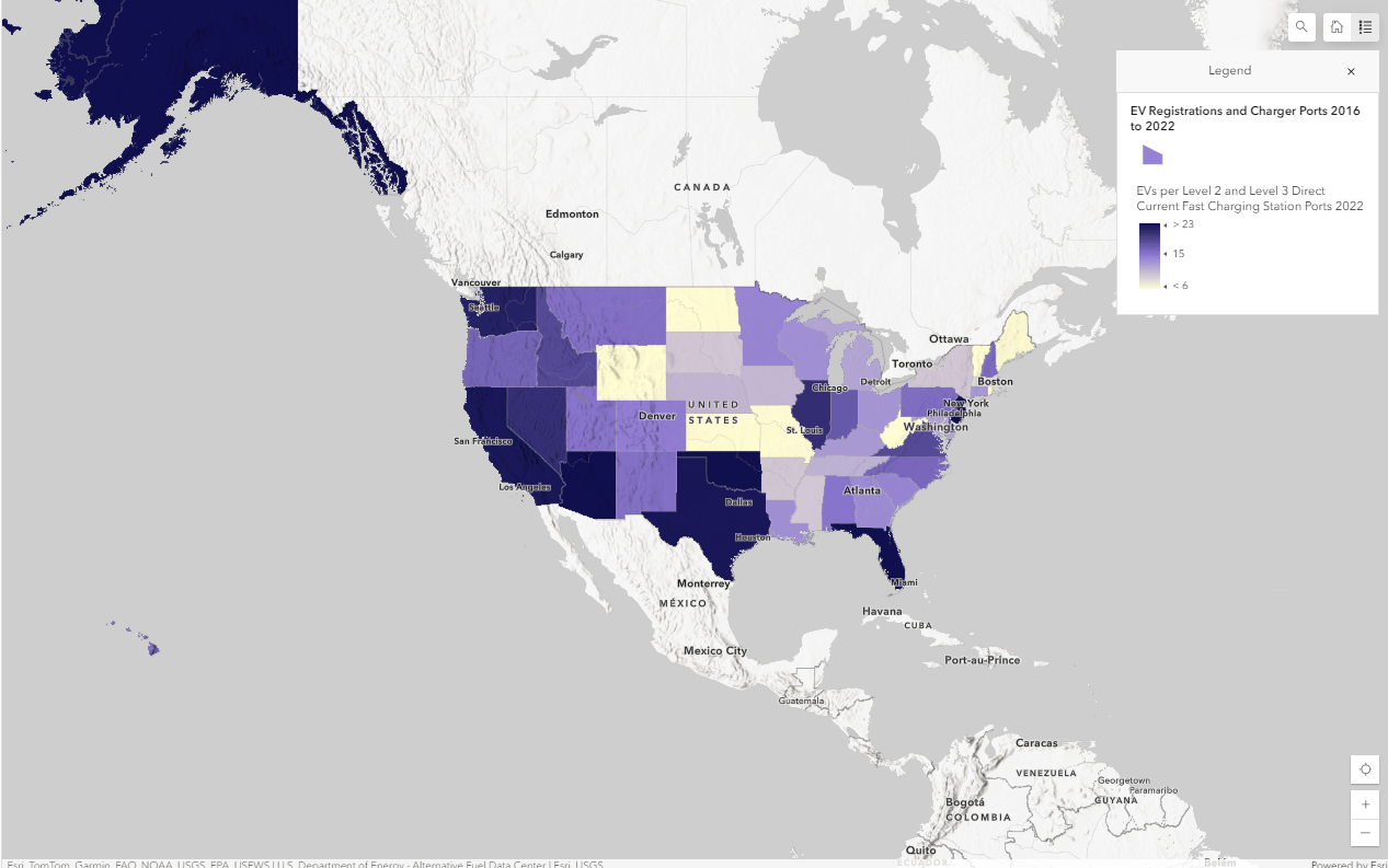 In order to determine if the supply of charging stations is meeting the demand of EVs, one measure is to calculate the ratio of EVs to charging station ports. Benchmarks set by the International Energy Association (IEA) suggests the minimum acceptable ratio of EVs to charging stations is about 10 EVs for every 1 charging station. The map below shows each states EV to charging station ratio. States in yellow indicate they have a lower ratio of EVs to level 2 and level 3/Direct Current Fast Charging station ports, while areas in dark purple indicate they have a higher ratio of EVs to level 2 and level 3/Direct Current Fast Charging station ports.