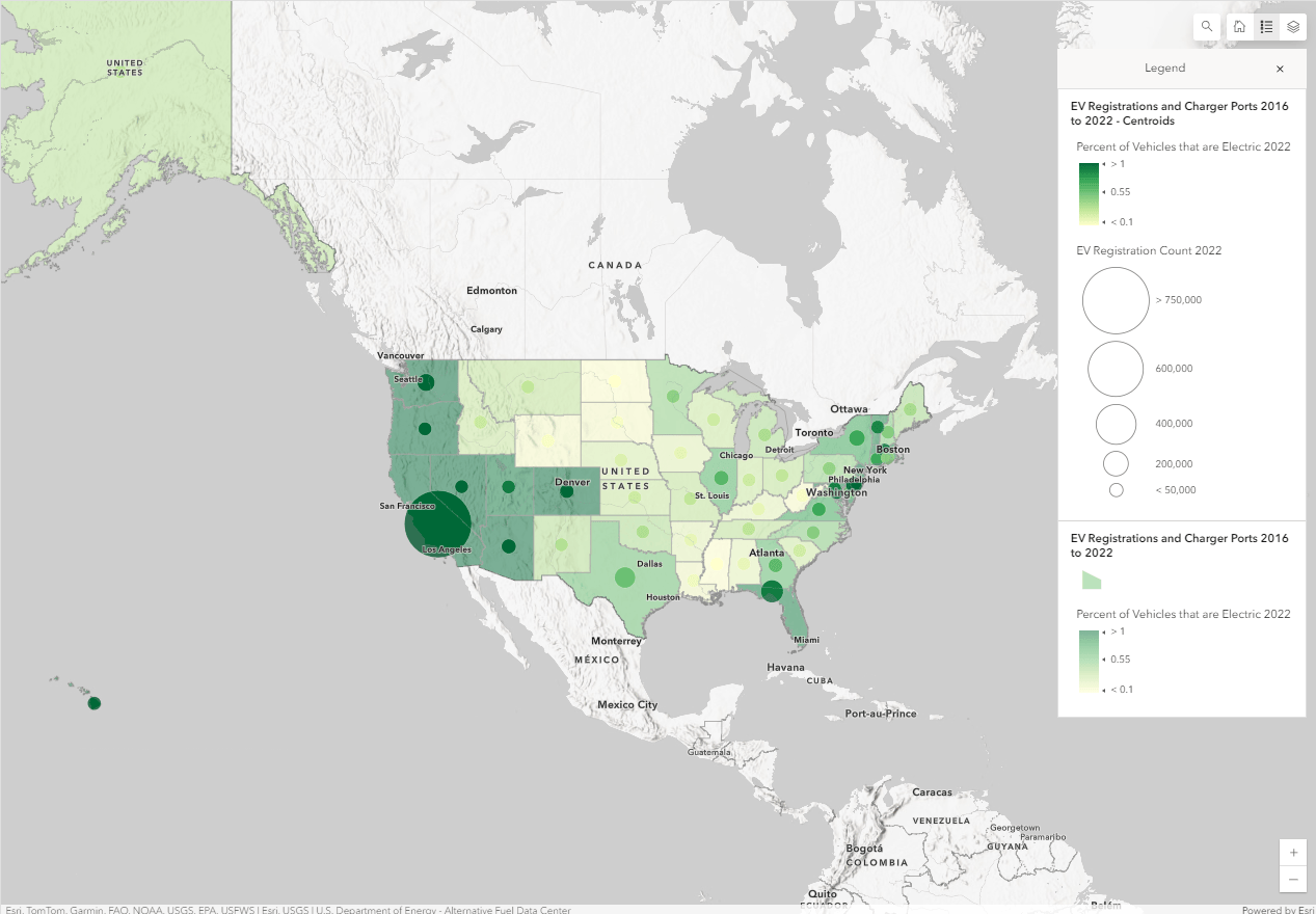 View this collection of ArcGIS StoryMaps on electric vehicle charging. This collection delves deeper into the electric alternative fuel stations and how EV Charging is being implemented across the U.S.