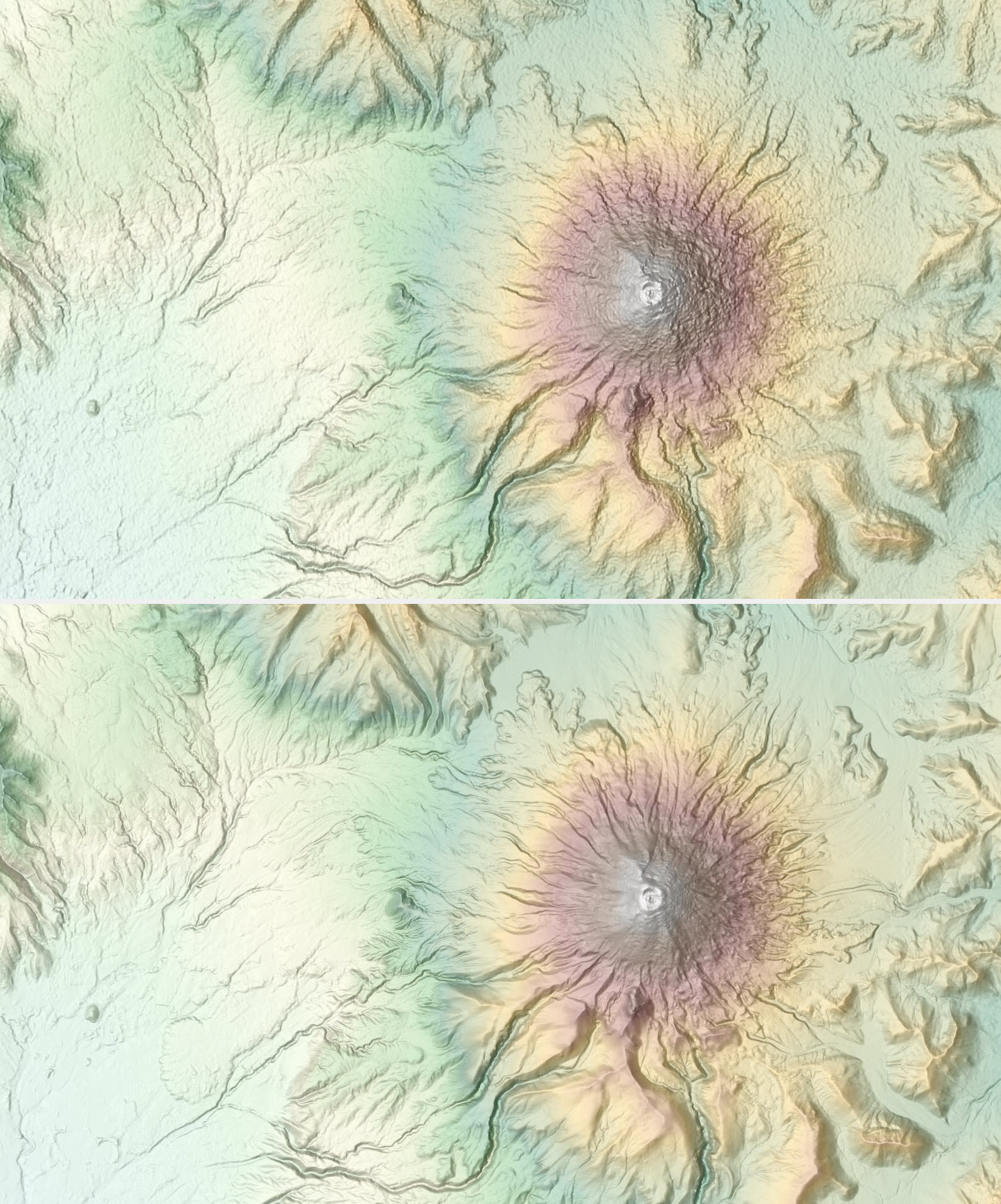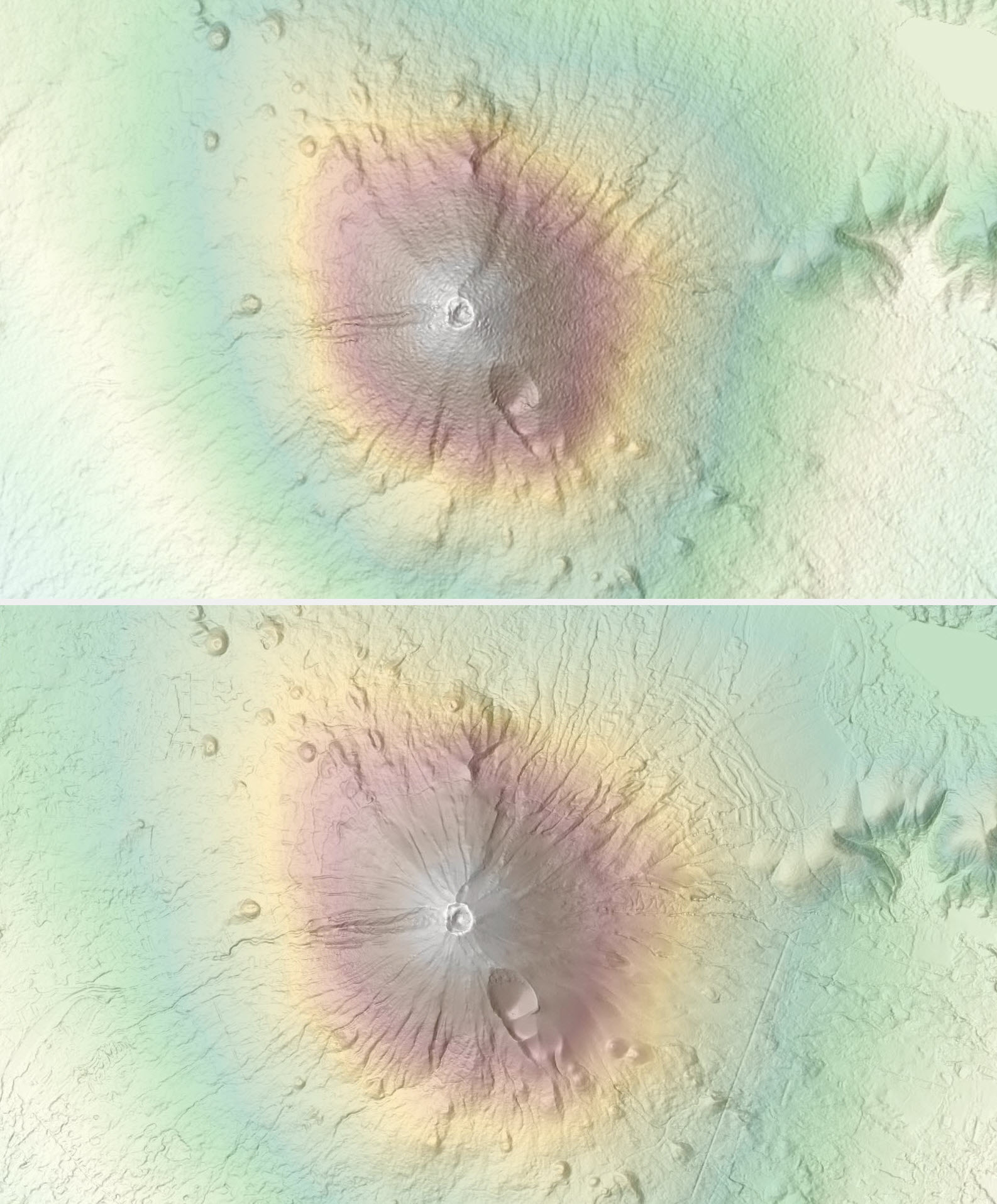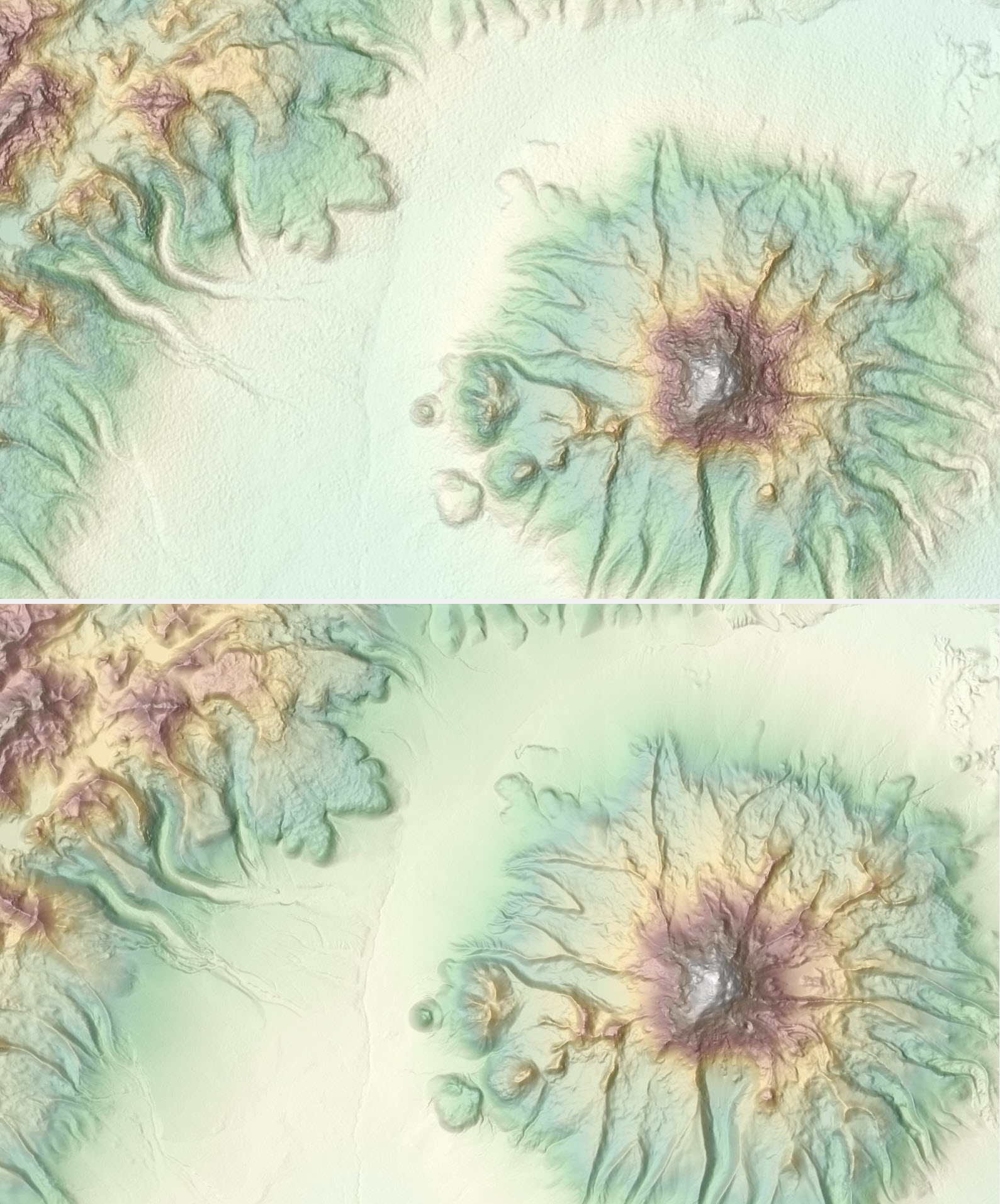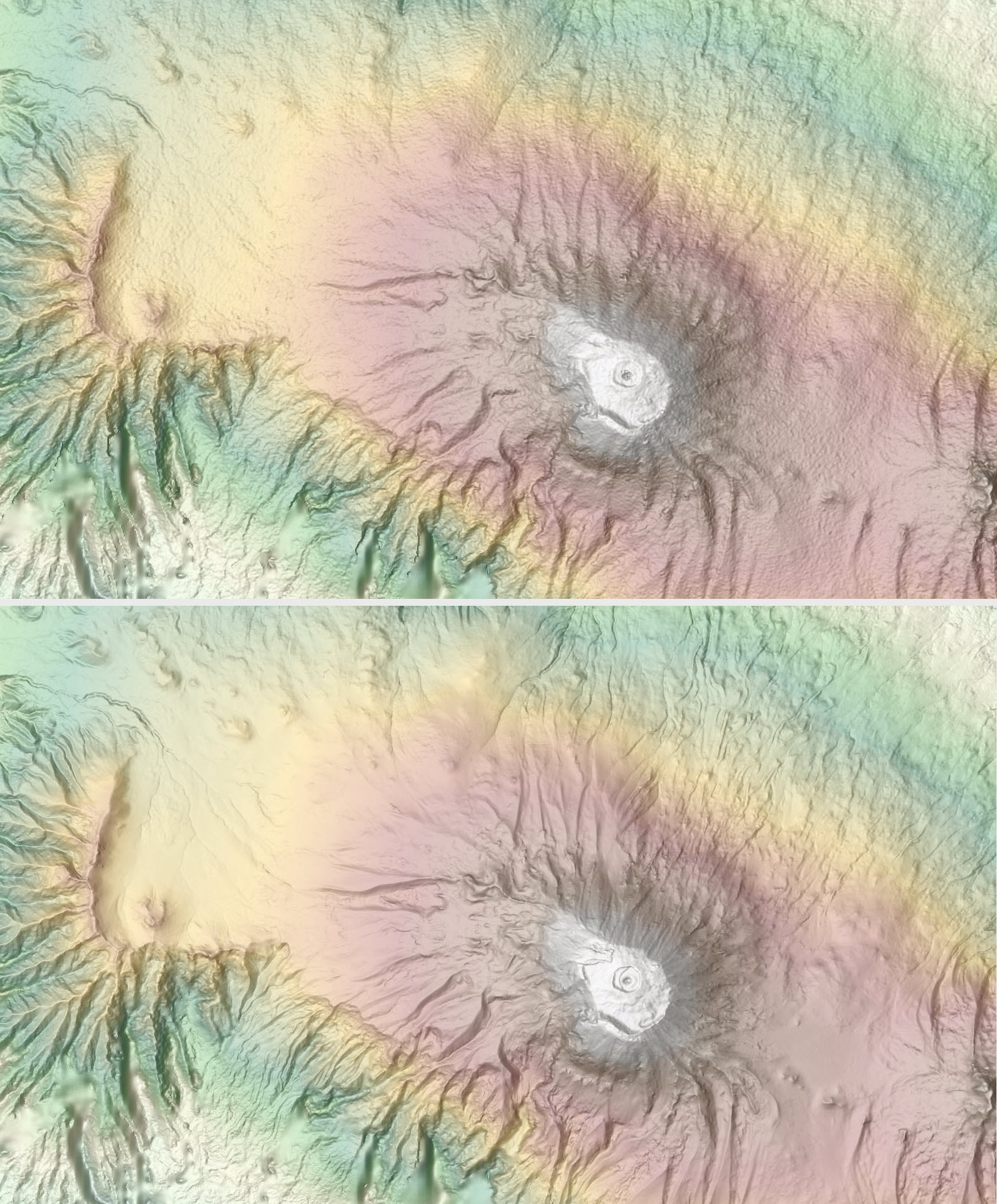 A portion near Ngorongoro Conservation Area, Tanzania depicted with newly released WorldDEM4Ortho 24 m (bottom) showing improvements over SRTM 30 m (top)