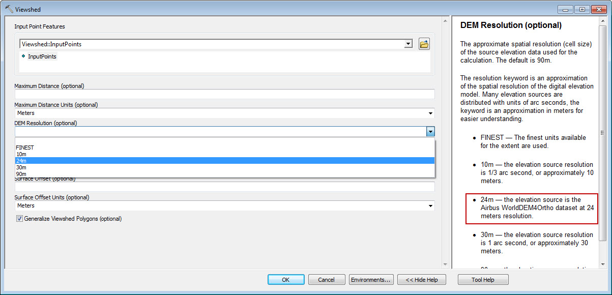 Airbus WorldDEM4Ortho is also rolled out in Elevation Analysis Tools (Profile, Viewshed and Summarize Elevation) and can be invoked in these tools by selecting 24 m option from the drop-down menu of DEM Resolution parameter.