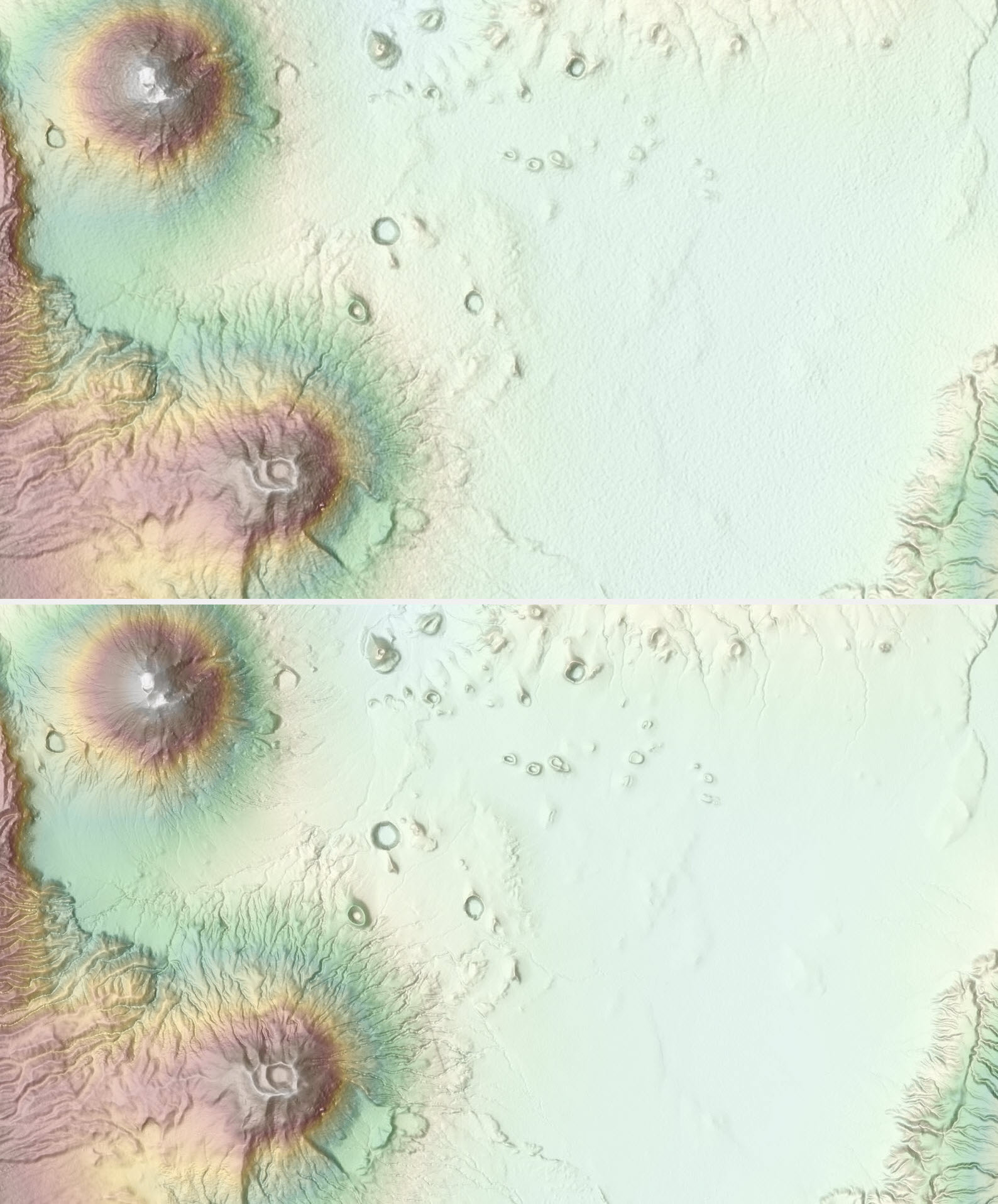 A portion near Ngorongoro Conservation Area, Tanzania depicted with newly released WorldDEM4Ortho 24 m (bottom) showing improvements over SRTM 30 m (top)