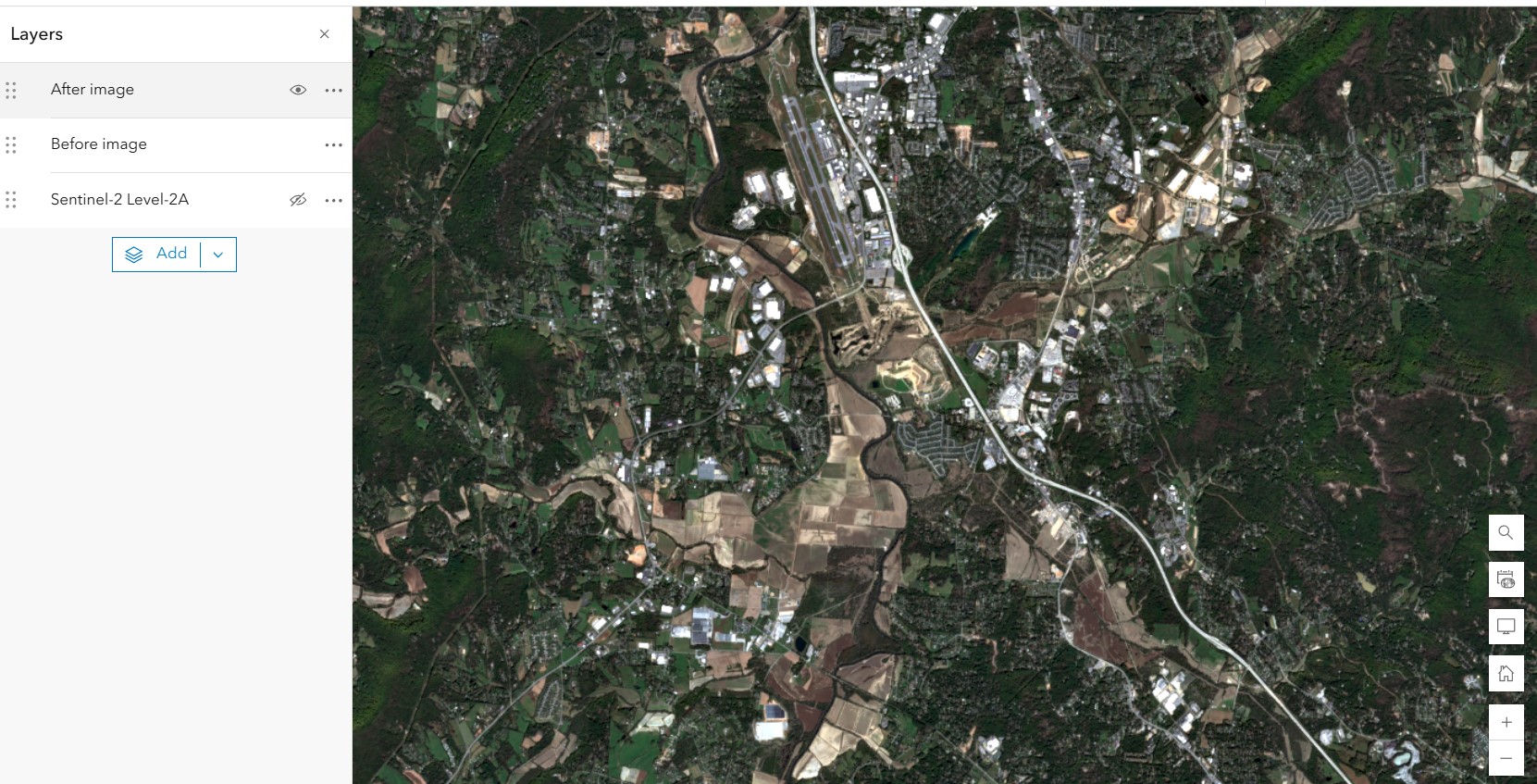 Zoom into the Asheville Regional Airport area in the south of Asheville, and switch between Before image and After image. The flooding areas on After image are striking. Now we have layers like this below. We will use this area as the processing extent.