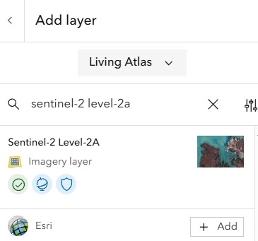 Follow the steps below to add data source Sentinel-2 Level-2A to the map. If you need to know more about adding data from ArcGIS Living Atlas, read this tutorial.