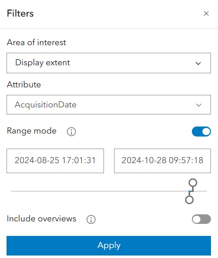 - To reduce the subset size further, click Filters on the ribbon, select AquisitionDate for Attribute, then drag the sliders to set a rough range that includes September 27, 2024, saying 2024-08-25 and 2024-10-28.
