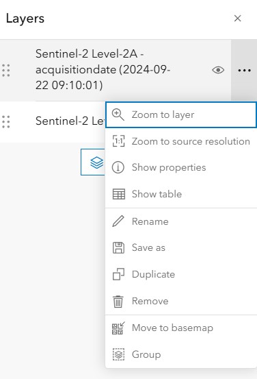 These selected scenes can be saved within the web map or you can save them to your organization to use them in other web maps. Select the image in the Layers pane, click the More Properties button, and select Save As to save it in your organization. This saved imagery layer is a version of the Sentinel 2A layer saved to your organization. This process is useful if you want to maintain access to that scene in the future.