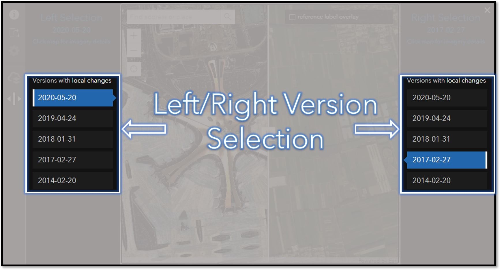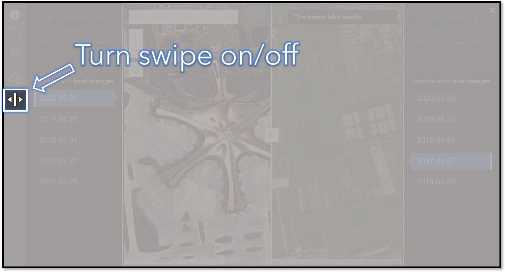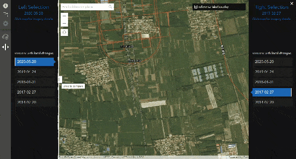 Use the Wayback version lists to make your left and right side imagery selections. Using the built in automated change detection, the lists you see in swipe mode only show “Versions with local changes”. This means only showing the versions when imagery changed at your current location and zoom level.