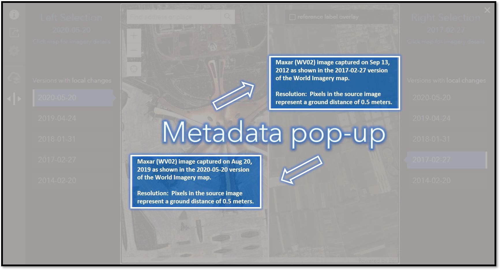 The name of a Wayback version designates when updates were published to World Imagery, not the date when the imagery was captured. A single publication date will include updates at varied locations with a range of imagery capture dates. To access imagery capture dates, point and click on the map to enable the metadata pop-up for that location. In swipe mode, clicking to the left or right side of the swipe bar displays metadata for the left or right version respectively.