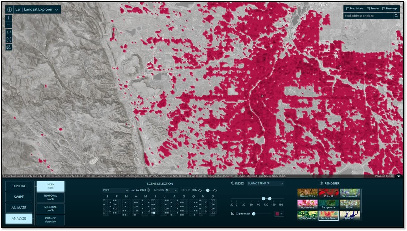 In this mode you can use spectral indices, derived from mathematical calculations, to measure relative abundance of things like water, moisture, and vegetation, and perform simple thresholding on land surface temperature to show relatively hot vs cool surface areas. As you move the slider, a mask is dynamically rendered on screen indicating the areas meeting the specified thresholds. Alternatively, the mask can be used to clip the image and only show the pixels covered by the mask. In the two images below, the first shows the areas with the healthiest vegetation. The second shows a surface temperature image clipped to show the hottest surface areas. Not surprisingly, there is a strong correlation in lack of vegetation and hot surface areas. If this sounds complicated, well, it’s not. Give it a try!