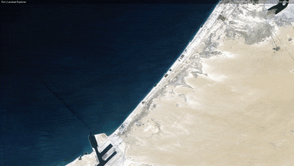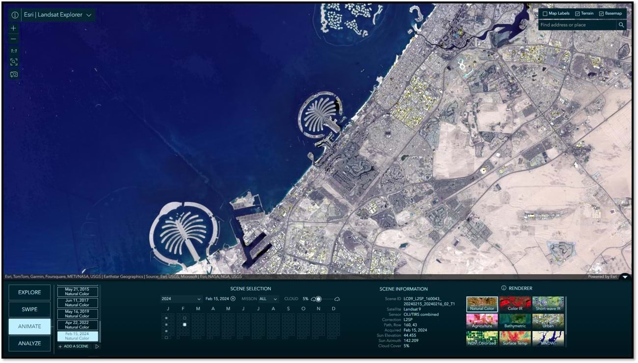 In Animate mode, you can select multiple scenes to create compelling time animations. Click “+ Add a Scene”, select a date, and repeat. When you have gathered your collection of images, click the play button to start the animation. During playback, you can choose your frame rate and optionally export your animation to an MP4 with the layout of your choosing. The animation below was constructed in just a few minutes. While coverage in this region was variable in the 80’s and 90’s, given licensing and technical constraints with Landsat 5 and 7, there are still enough scenes options to generate a time series animation of urban sprawl in Dubai, UAE, one of the fastest growing urban areas in the world.