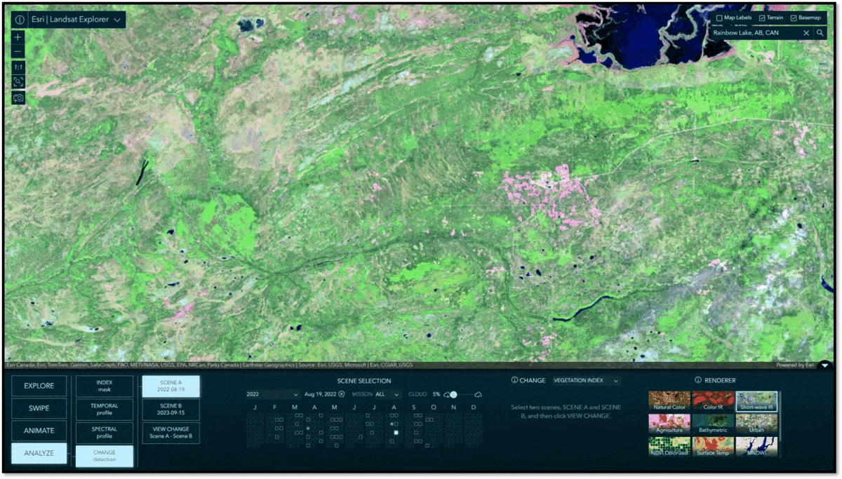 In Swipe mode, you can select two scenes to swipe and visually compare differences between them. It is common to choose between scenes of different dates, but you can also swipe and compare different renderings of the same date, or mix and match. Swipe is a simple yet extremely powerful way to visually detect, explore, and analyze differences and similarities between two images. Below is a before and after comparison from the 2023 Long Lake Fire in Alberta, CAN. The image on the left shows pre-fire conditions, while the image on the right is post-fire, where the burn scars are readily visible as a fuchsia color in this Short Wave Infrared spectral rendering.