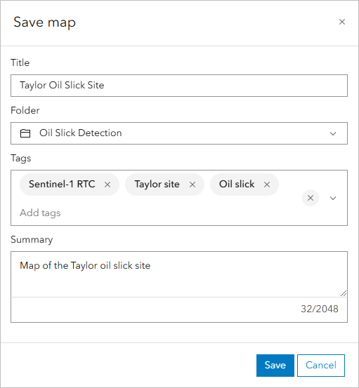 - For Tags, type “Sentinel-1 RTC”, “Taylor site”, and “Oil slick” and press Enter after each tag.