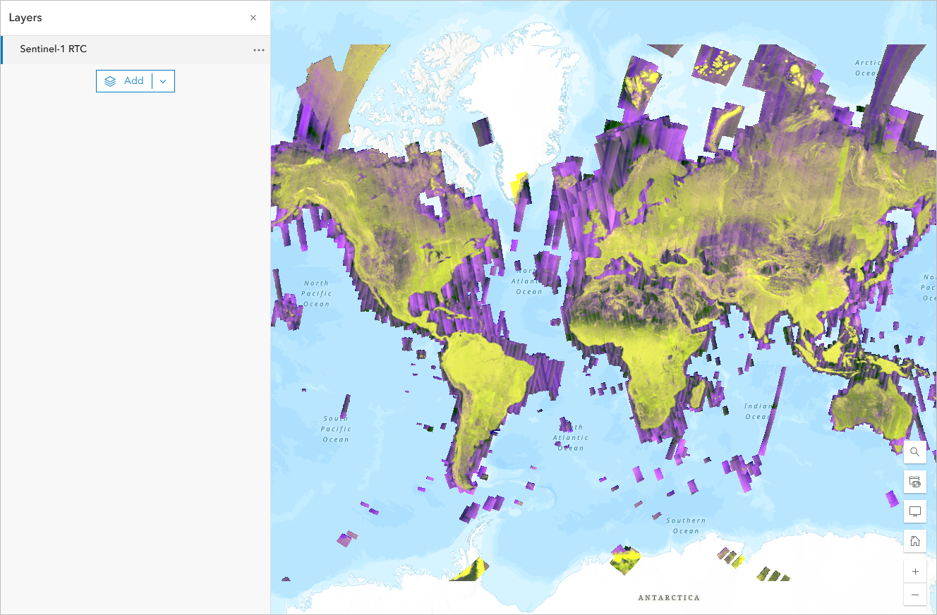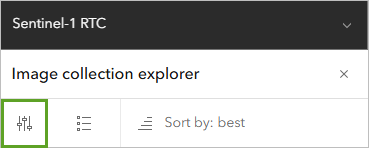 - In the Layers pane, confirm that the Sentinel-1 RTC layer is selected. Then click the Image collection explorer button on the right ribbon.