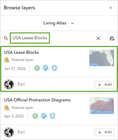 - In the result list, identify the USA Lease Blocks layer owned by Esri.