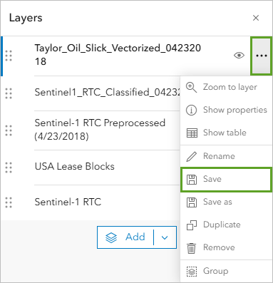 - In the Layers pane, point to the Taylor_Oil_Slick_Vectorized_04232018 layer, click Options, and choose Save.