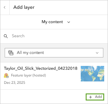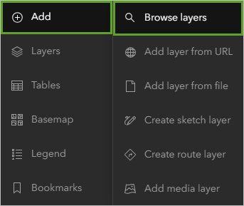 - In your Taylor Oil Slick Site web map, on the left ribbon, click the Add button and choose Browse layers.