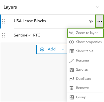 - In the Layers pane, point to the USA Lease Blocks layer, click Options, and choose Zoom to layer.
