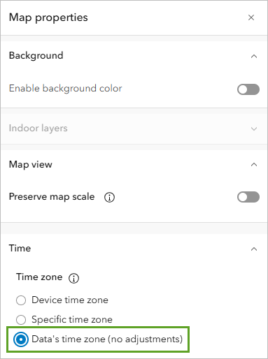 - In the Map properties pane, under Time, for Time zone, select Data’s time zone (no adjustments). This displays the date and time based on the time zone that has been defined for the Sentinel-1 RTC layer.