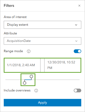 - In the Filters window, Under Attribute, select AcquisitionDate.