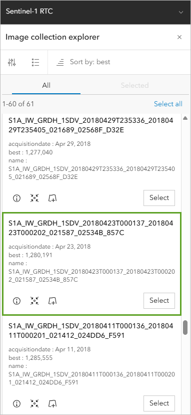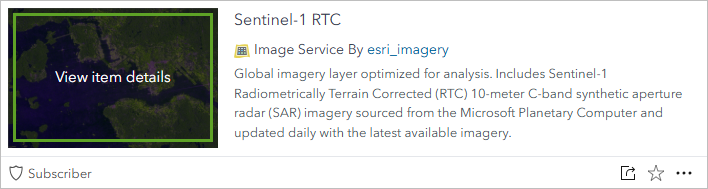 - Point to the Sentinel-1 RTC thumbnail and click View item details.