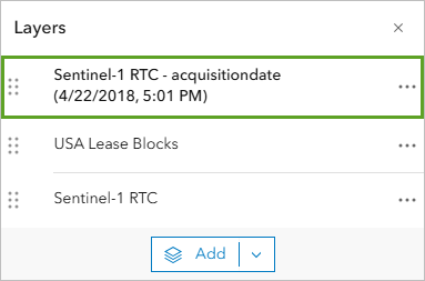 Next, you’ll continue preparing your map. The Sentinel-1 RTC dynamic imagery layer contains a growing archive of Sentinel-1 imagery (from 2014 to present) all over the world. You’ll select a single image from the archive for your analysis. That image should cover the Taylor site and have been captured around your date of interest (April 2018). You’ll also apply on-the-fly preprocessing to this image to obtain the appropriate rendering for your workflow.