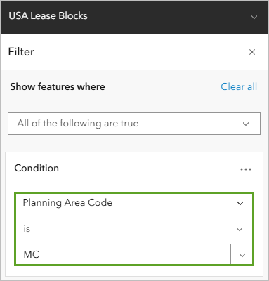 - In the Filter window, click Add new, and use the fields to create the condition Planning Area Code is MC.
