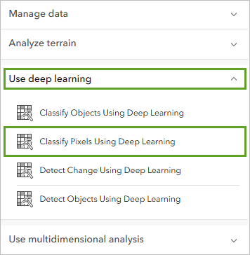 - In the Tools pane, expand Use deep learning and click Classify Pixels Using Deep Learning.