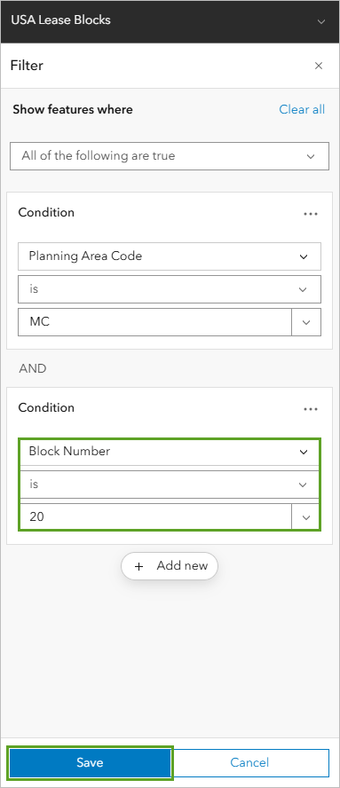 - Click Add new to add another condition, use the fields to create the second condition Block Number is 20, and click Save.