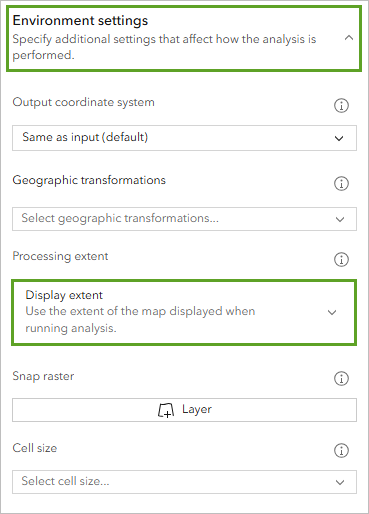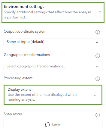 - Expand the Environment settings tool pane, and select Display extent for Processing extent.