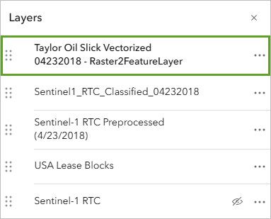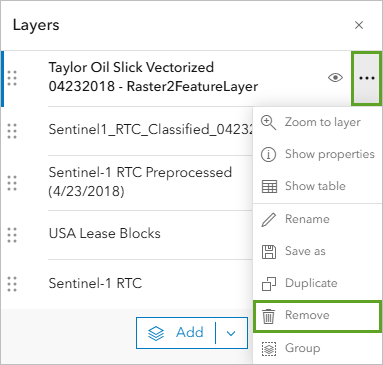 - In the Layers pane, point to the Taylor Oil Slick Vectorized 04232018 – Raster2FeatureLayer layer, click Options, and choose Remove.