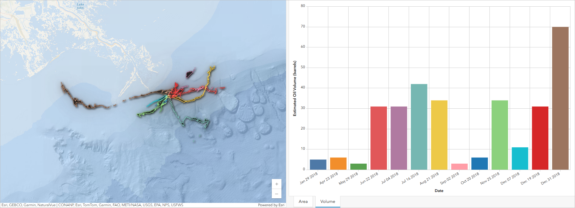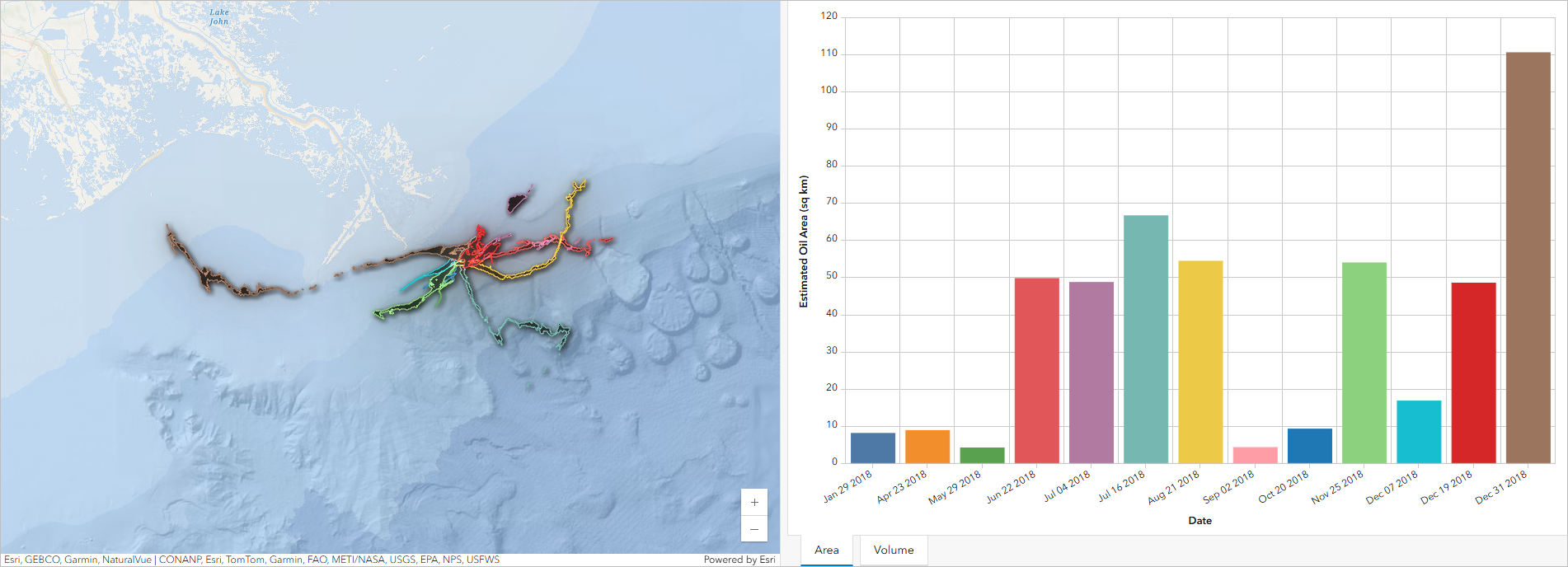 Moving forward, you could use the same workflow repeatedly to analyze data over time and gain further insights into the extent of the oil slicks caused by the Taylor Energy oil spill over the past 15 years. For example, a dashboard of the 2018 oil slicks has been created, highlighting their estimated area and volume. The dashboard clearly demonstrates the variability in oil slick spatial extent, surface coverage, and estimated volume over time.