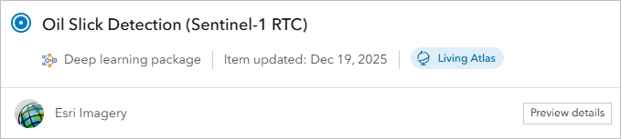 - In the list of results, identify the Oil Slick Detection (Sentinel-1 RTC) deep learning package owned by esri_imagery. Select it then click Confirm.