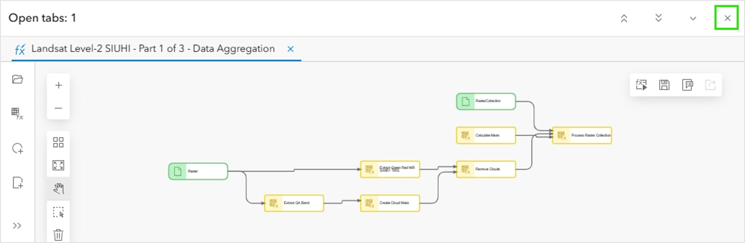 The next part of the workflow is to calculate a surface heat index using the outputs from Part 1 and Part 2. This RFT uses the Extract Band, Band Arithmetic, Clip, and Zonal Statistics Raster Functions. The steps include: