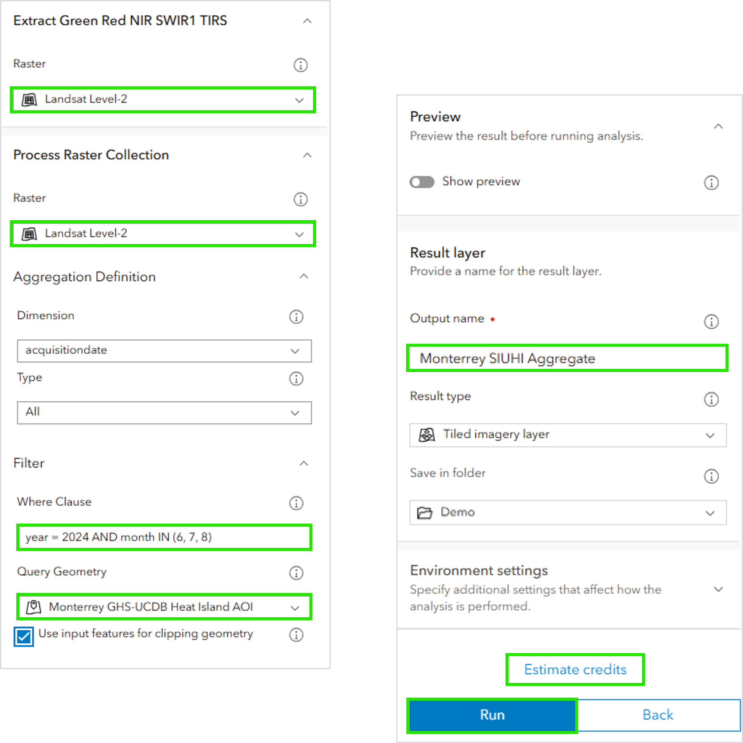 - Select Monterrey GHS-UCDB Heat Island AOI as the input Query Geometry and select the option to Use input features for clipping geometry. This will further constrain the aggregation to images intersecting the AOI.
