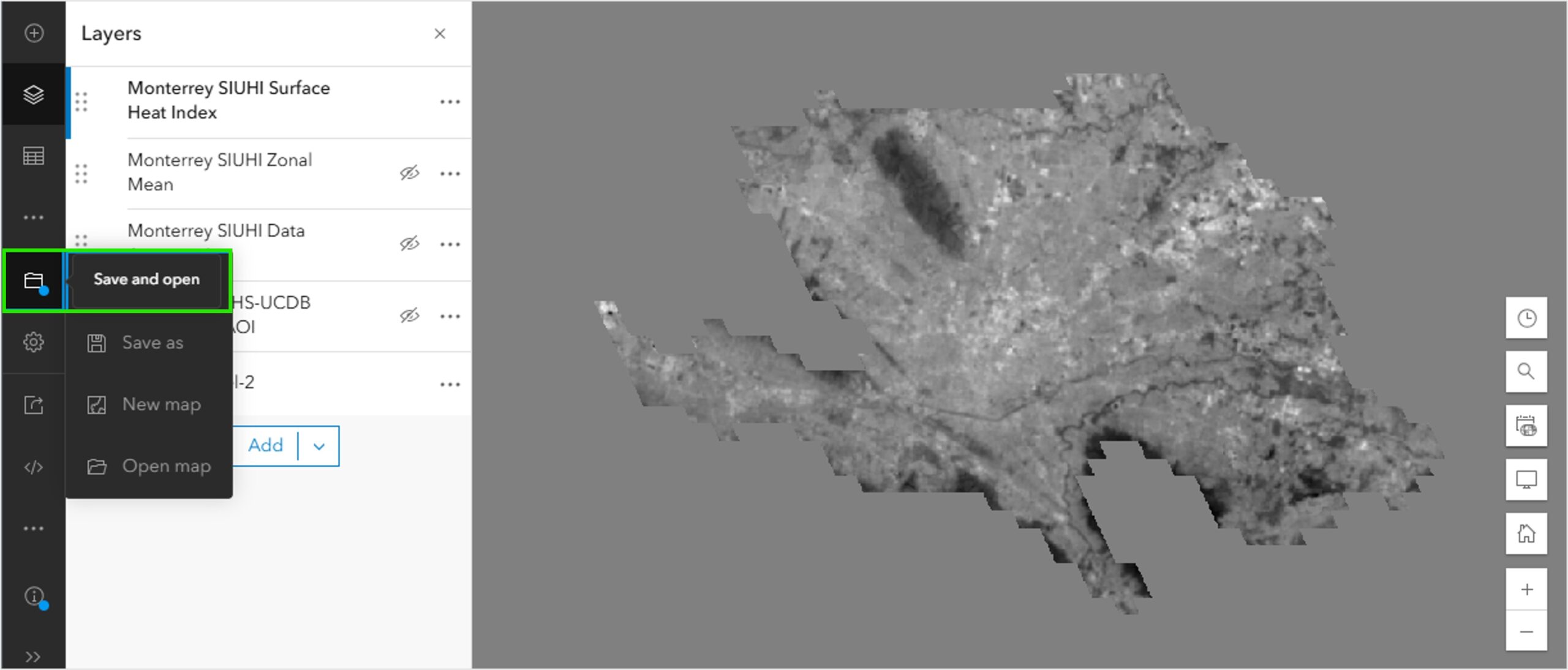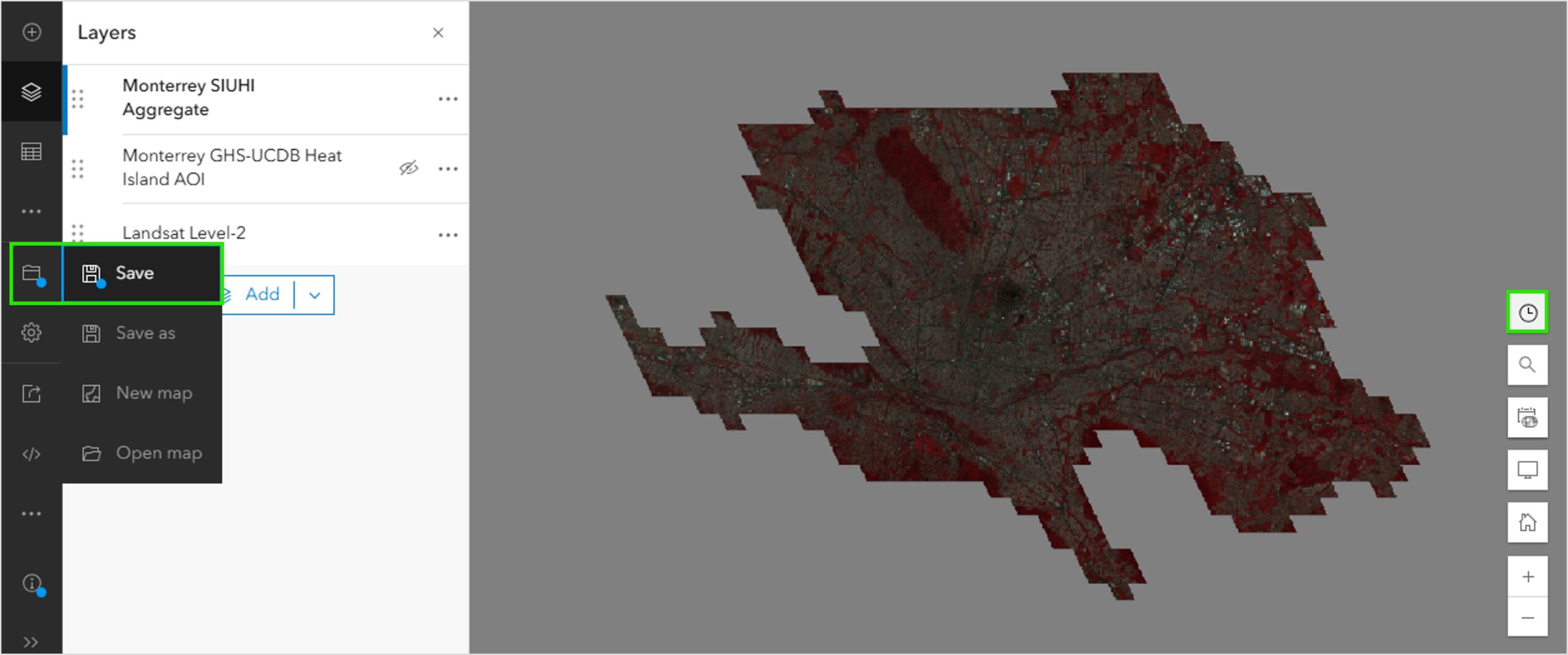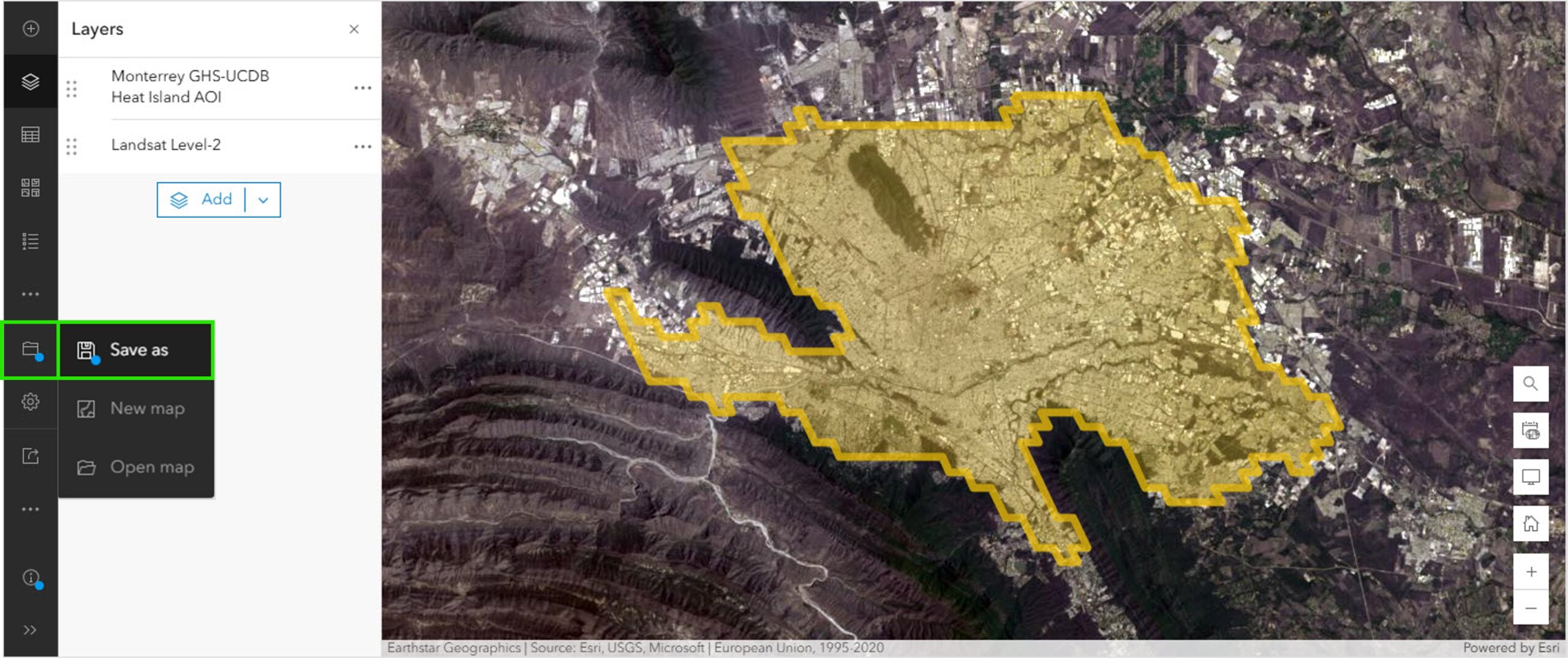 Step 7: With all three RFT’s, the Landsat Level-2 imagery layer, and the Monterrey AOI successfully loaded into the map, click Save and Save As to save the project as a Web Map item in your ArcGIS Online account named “Monterrey, MX SIUHI“. You are now ready for Analysis Part 1.