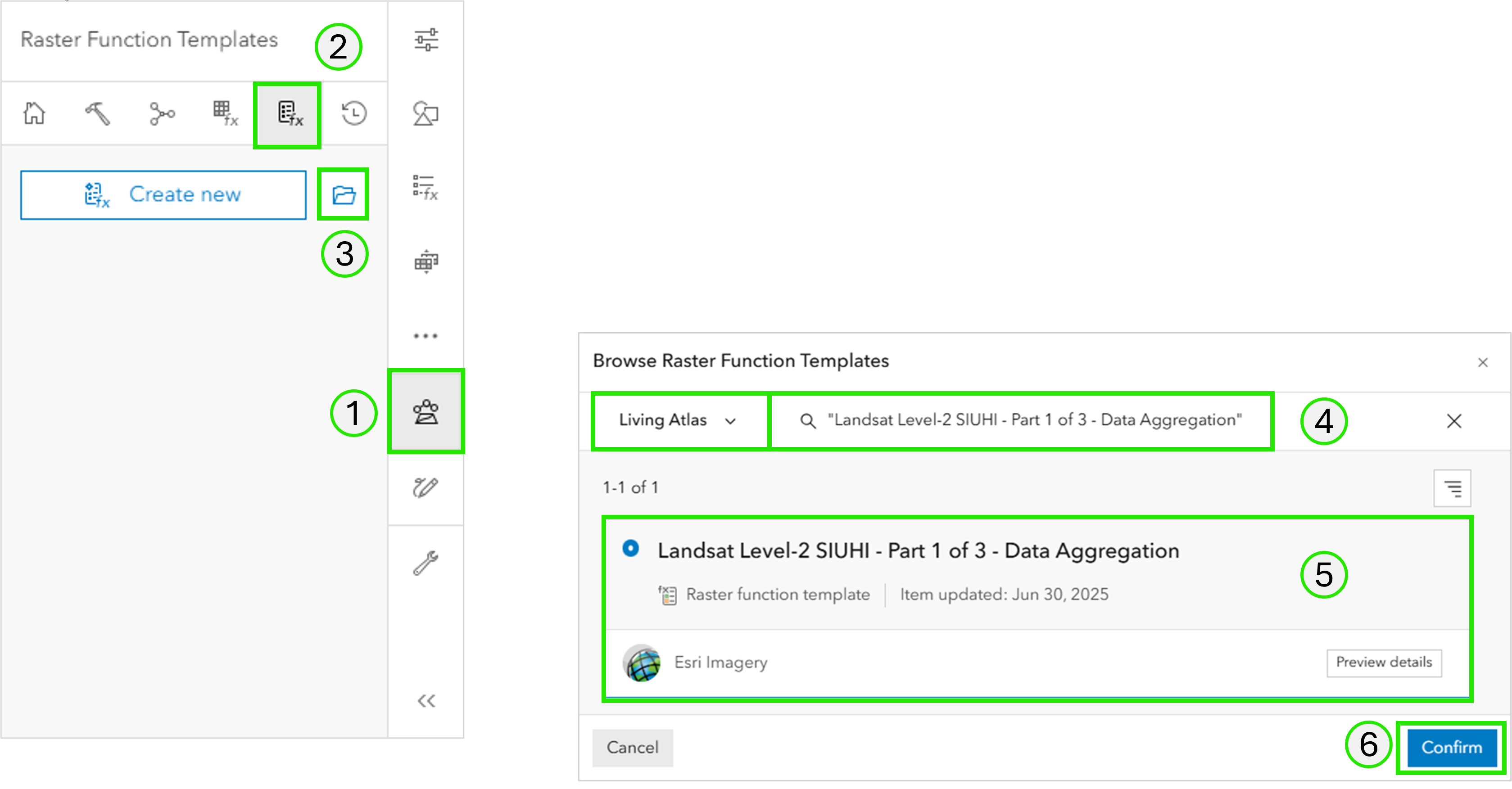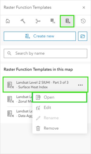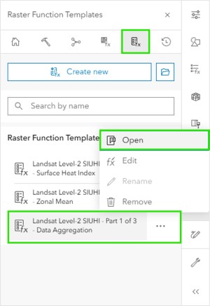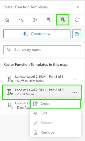 Step 1: Open the first RFT. Within the Analysis options , open the Raster Function Templates panel, click the three dots on Landsat Level-2 SIUHI – Part 2 of 3 – Zonal Mean, and select Open.