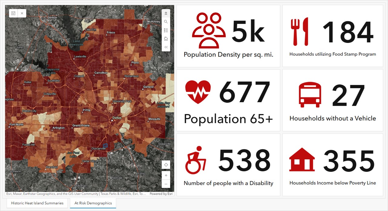 The following example dashboard was created combining a couple of the examples from above. We looked at Dallas, TX and created annual urban heat maps from 1985 to present to analyze trends over time by census tract. We also analyzed how heat severity is impacting different demographics across census tracts.