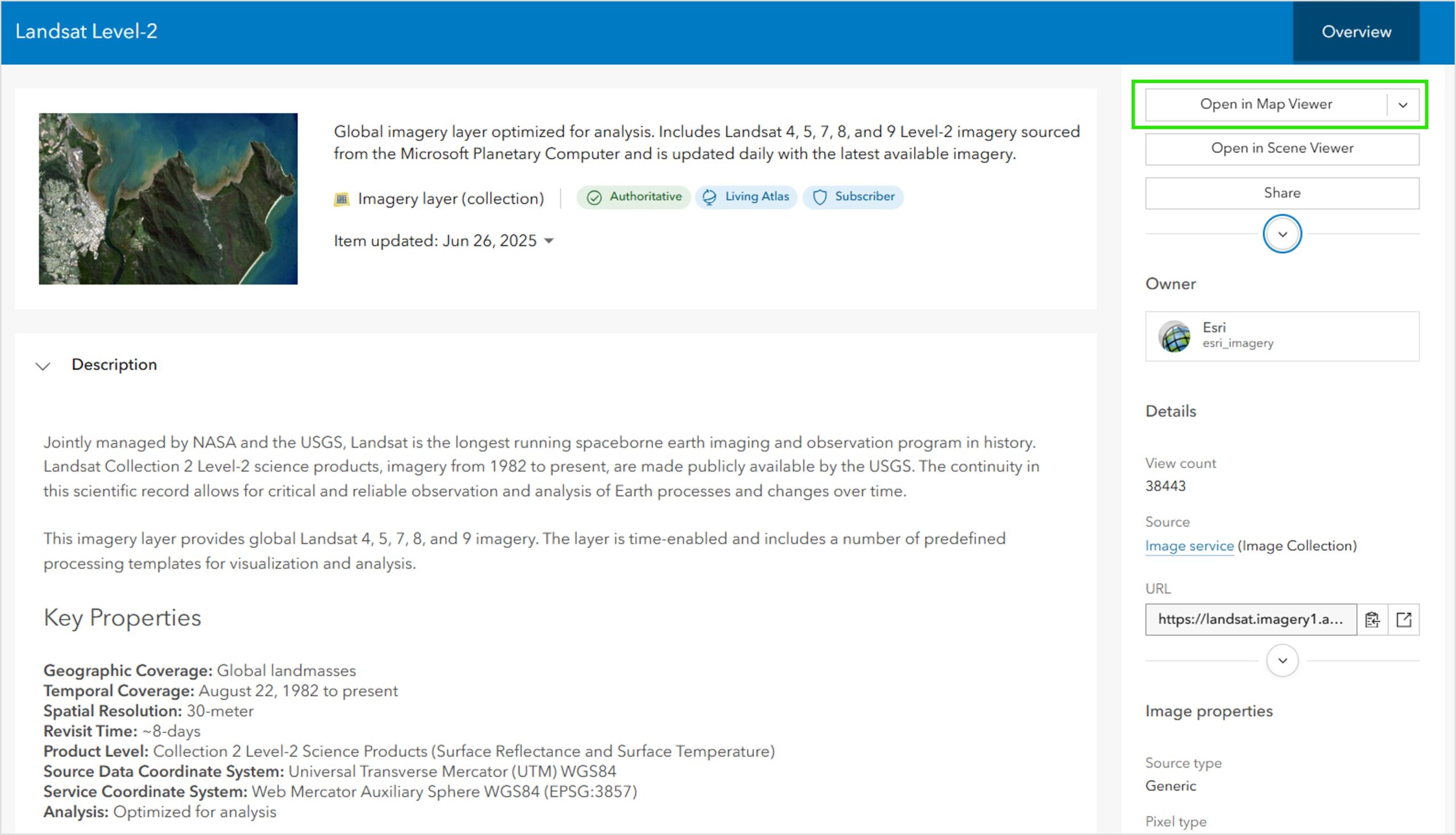 Step 2: All of the details of what this imagery layer provides can be found on this item page, including key properties, available spectral bands, and more. When you are ready to proceed, click Open in Map Viewer.