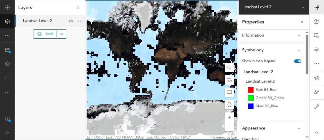 The Landsat imagery layer should now be displayed in Map Viewer. The layer loads with a default “Natural Color” (RGB) rendering.