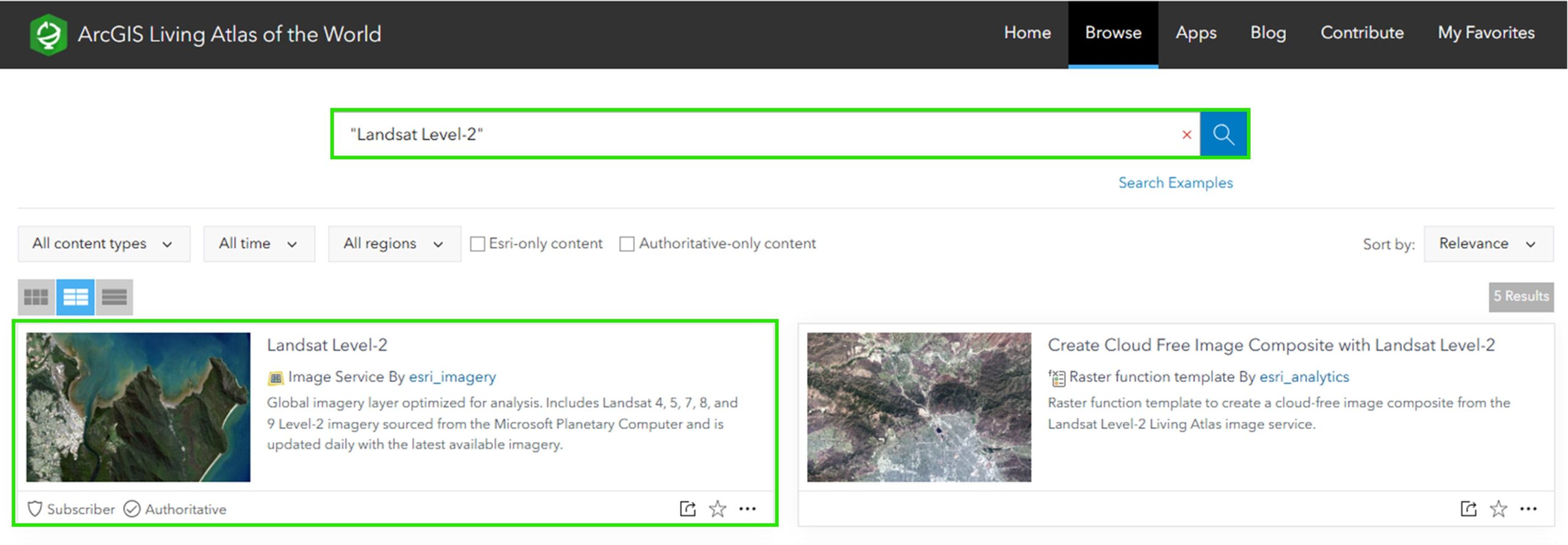 Step 1: Go to the ArcGIS Living Atlas of the World website, enter “Landsat Level-2” in the search bar, and click search. Find the Landsat Level-2 item and click the thumbnail to View item details.