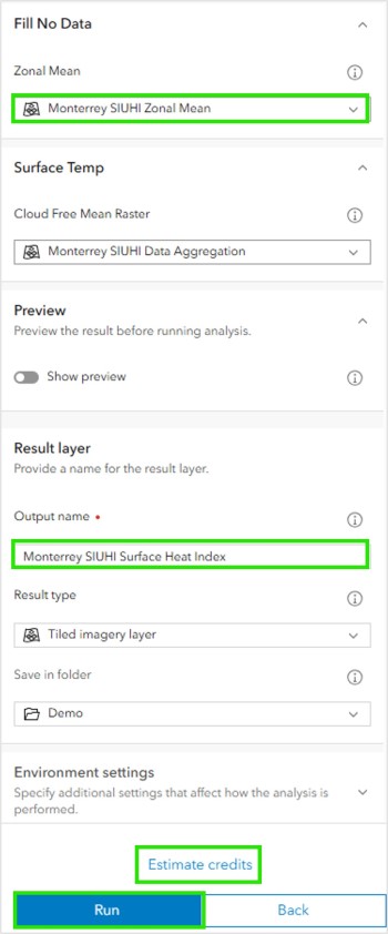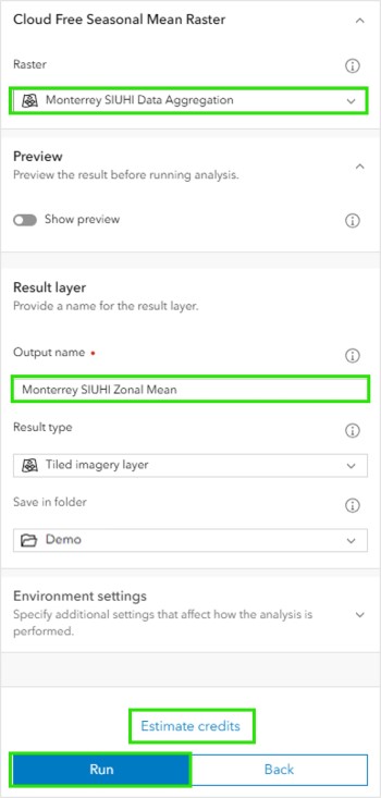 Step 2: With the input parameters panel now open, enter the required information and run the RFT. Select “Monterrey SIUHI Data Aggregation” as your input Raster, provide an output name of “Monterrey SIUHI Zonal Mean“, click Estimate credits and then Run.