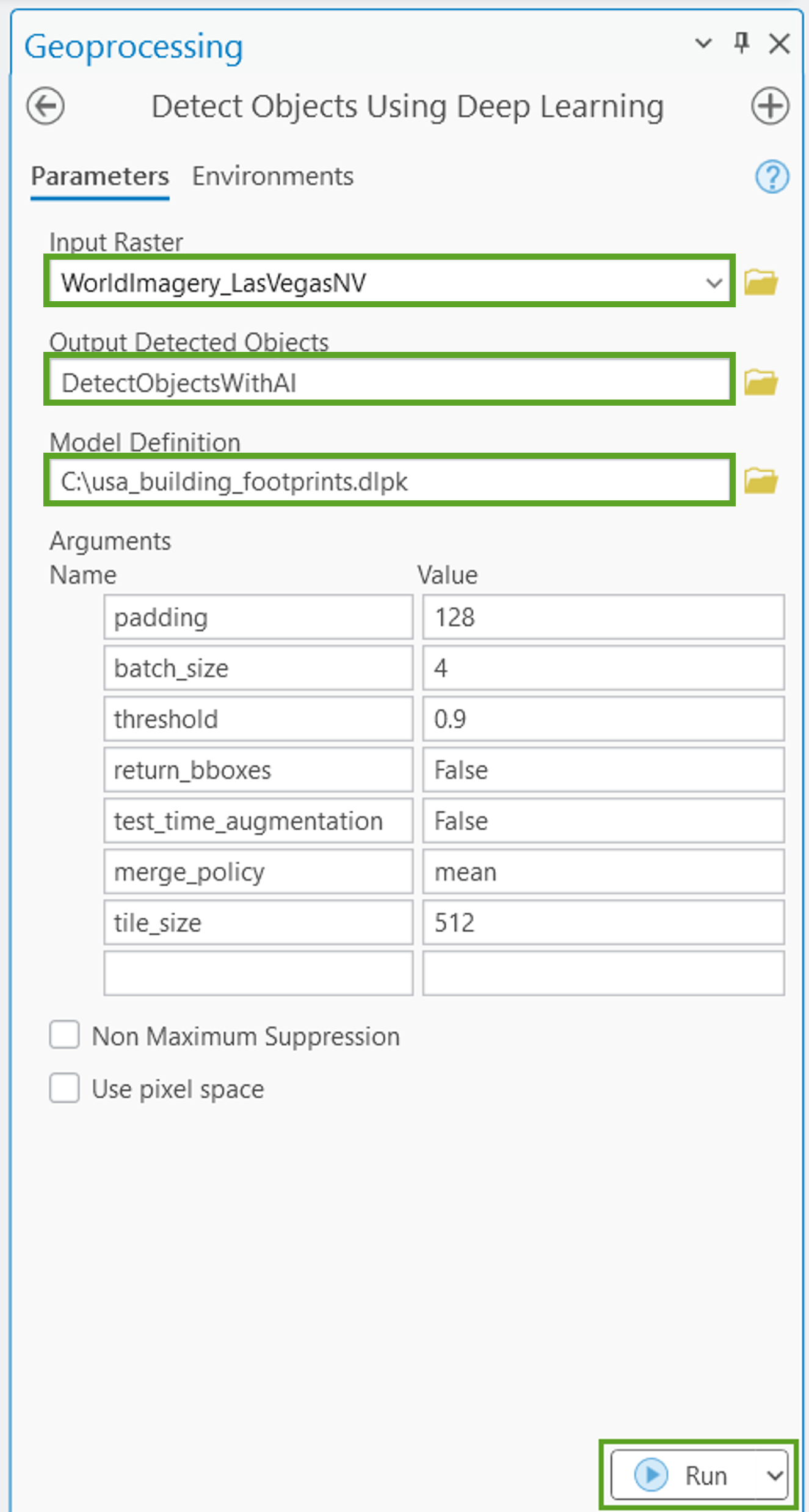 Step 6 – Click Run. The process may take up to several hours to complete. When it is done, review the results in the map frame. If the results aren’t satisfactory, adjust the arguments and try running the process again. Information regarding how to fine tune the model can be found here.