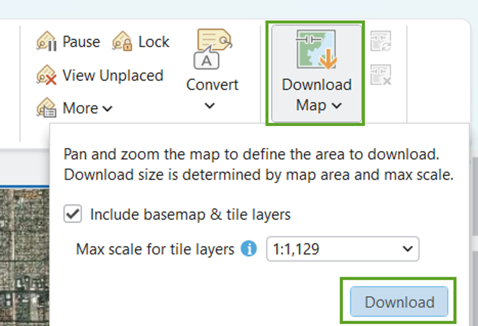 Step 4 – To download a tile package of the current extent, go to the ribbon (ensure it’s still on the Map tab) and find the Offline group. Click the Download Map button.