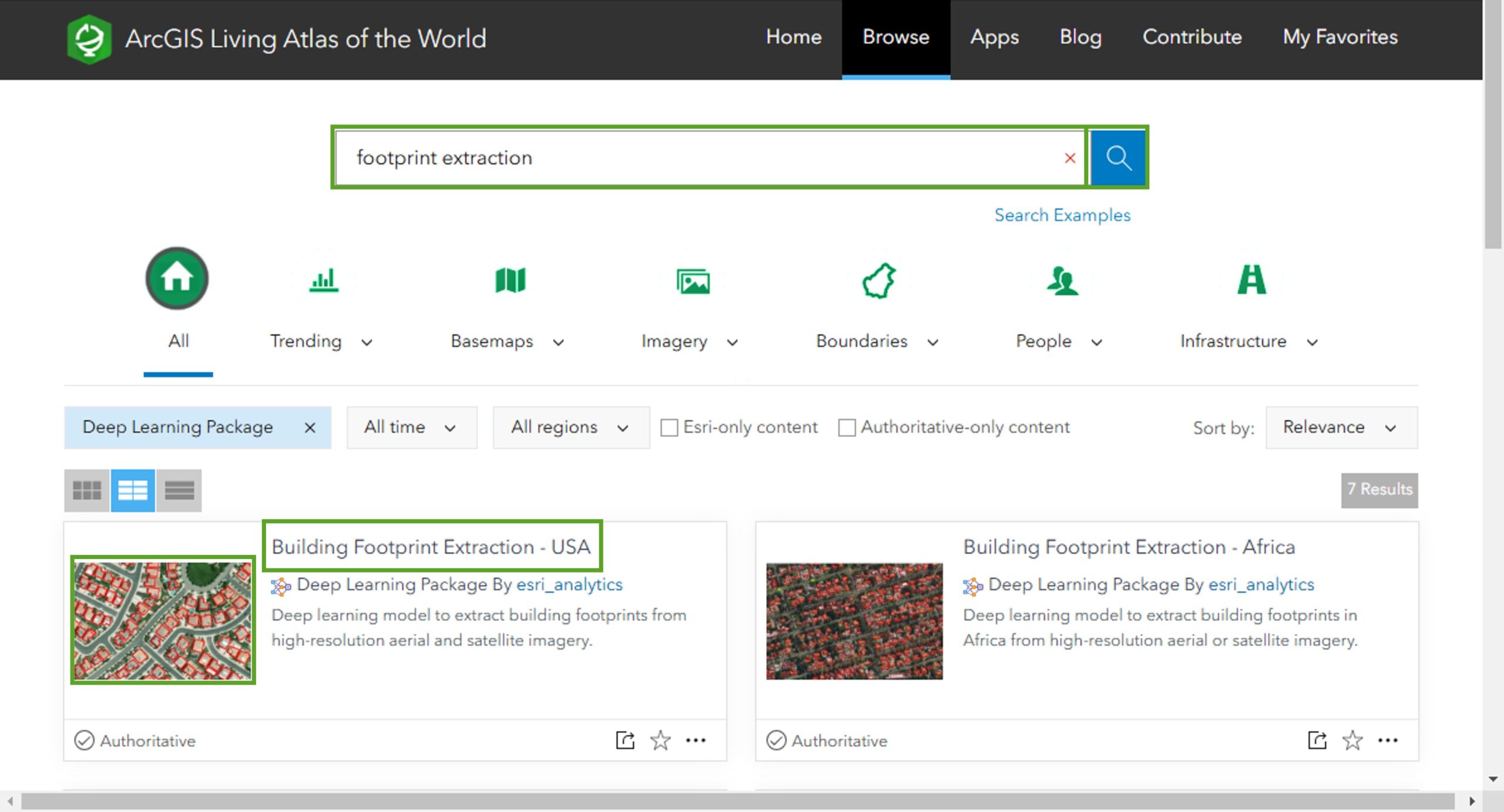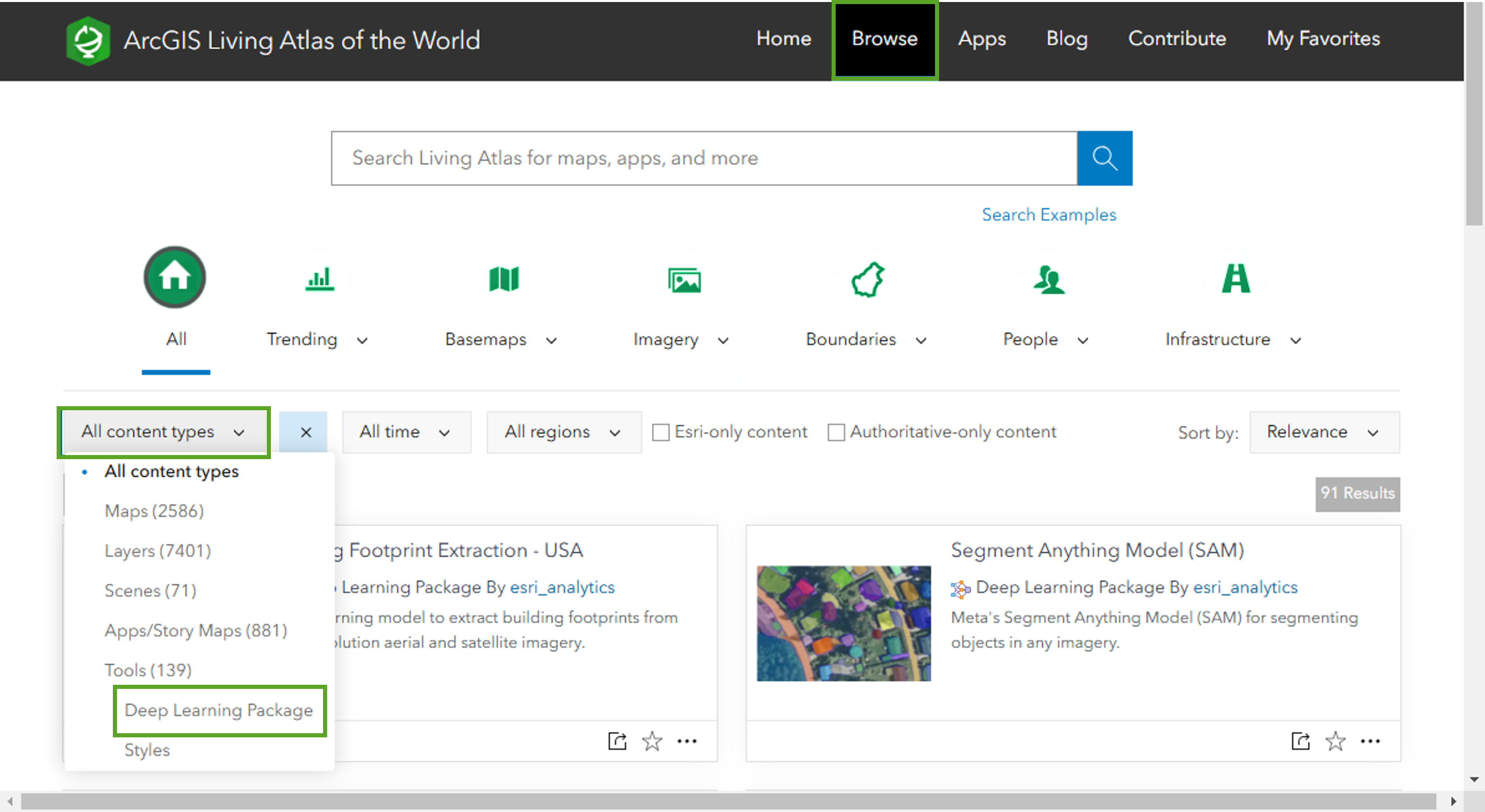 Step 1 – Go to the Living Atlas website https://livingatlas.arcgis.com and click Browse on the right side of the top banner. Click the Content Types dropdown above the content cards and select Deep Learning Package. The results will now be filtered to show all the deep learning packages available in Living Atlas.