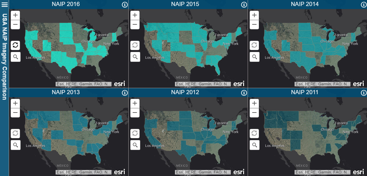 The imagery is made available by the USDA Farm Service Agency. The National Agriculture Imagery Program (NAIP) acquires aerial imagery during the agricultural growing seasons in the continental United States. The image layers published by Esri include all NAIP imagery since 2010 and provide access to imagery for each state in 4-bands (RGB and Near Infrared) with the option to display the imagery as false color or to display the NDVI showing relative biomass of an area. Using the image layers, you can access the different vintages of imagery over time to better understand how conditions have changed (click on image below).
