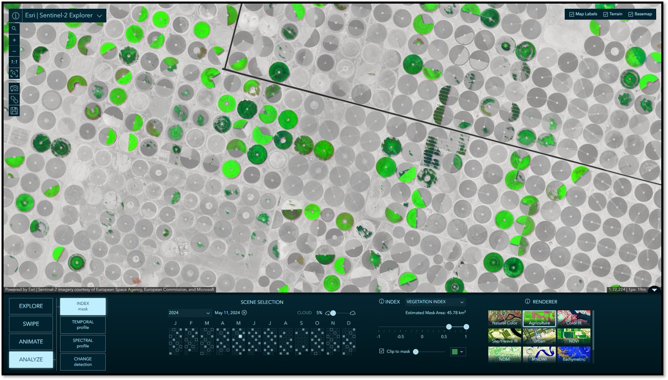 In Animate mode, you can select multiple scenes to create compelling time animations. Click “+ Add a Scene”, select a date, and repeat. When you have gathered your collection of images, click the play button to start the animation. During playback, you can choose your frame rate and optionally export your animation to an MP4 with the layout of your choosing. The animation below was assembled in just a few minutes, showing seasonal center-pivot agricultural field variation in the desert near Tubarjal, Saudi Arabia throughout 2024.