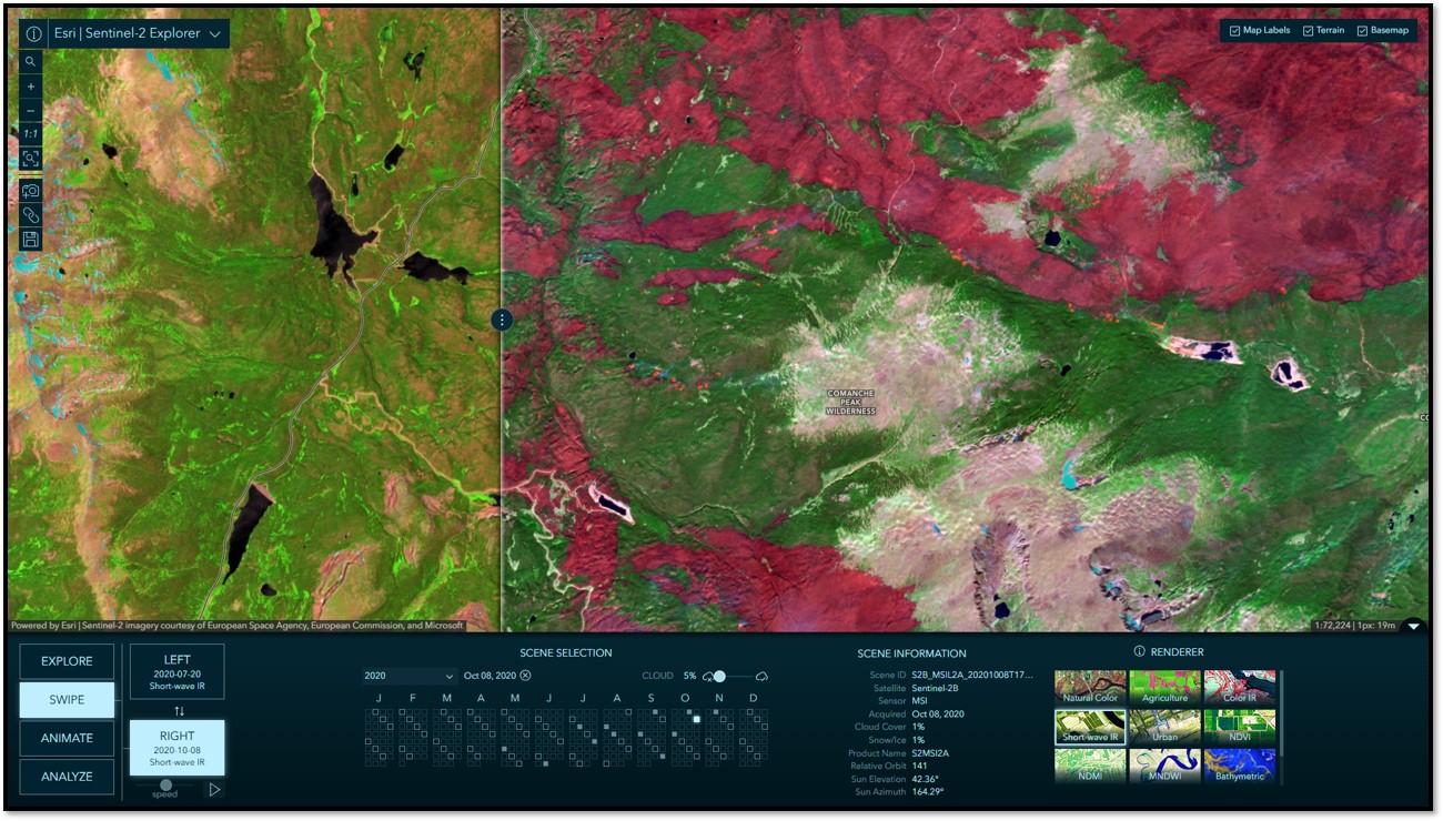 In Swipe mode, you can select two scenes to swipe and visually compare differences between them. It is common to choose between scenes of different dates, but you can also swipe and compare different renderings of the same date, or mix and match. Swipe is a simple yet very powerful way to visually detect, explore, and analyze differences and similarities between two images. Below is a before and after comparison from a portion of the 2020 Cameron Peak fire in Colorado, USA. The image on the left shows pre-fire conditions, while the image on the right is post-fire, where the burn scars are readily visible as a fuchsia color in this Short Wave Infrared spectral rendering. Also visible in the image on the right are some active fire hot spots shown in orange.