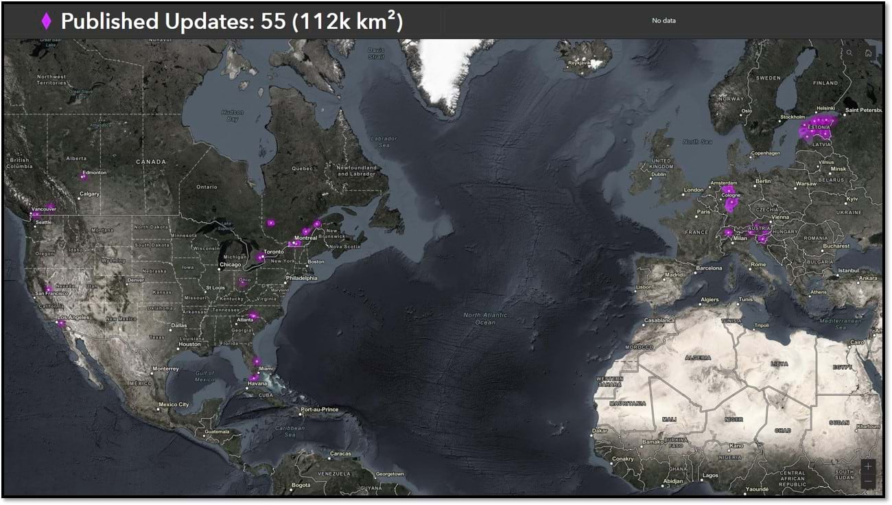 Since the announcement in July, we have received and published nearly half of the total 60-cm expanded coverage. The map below depicts which areas have already been published to World Imagery.