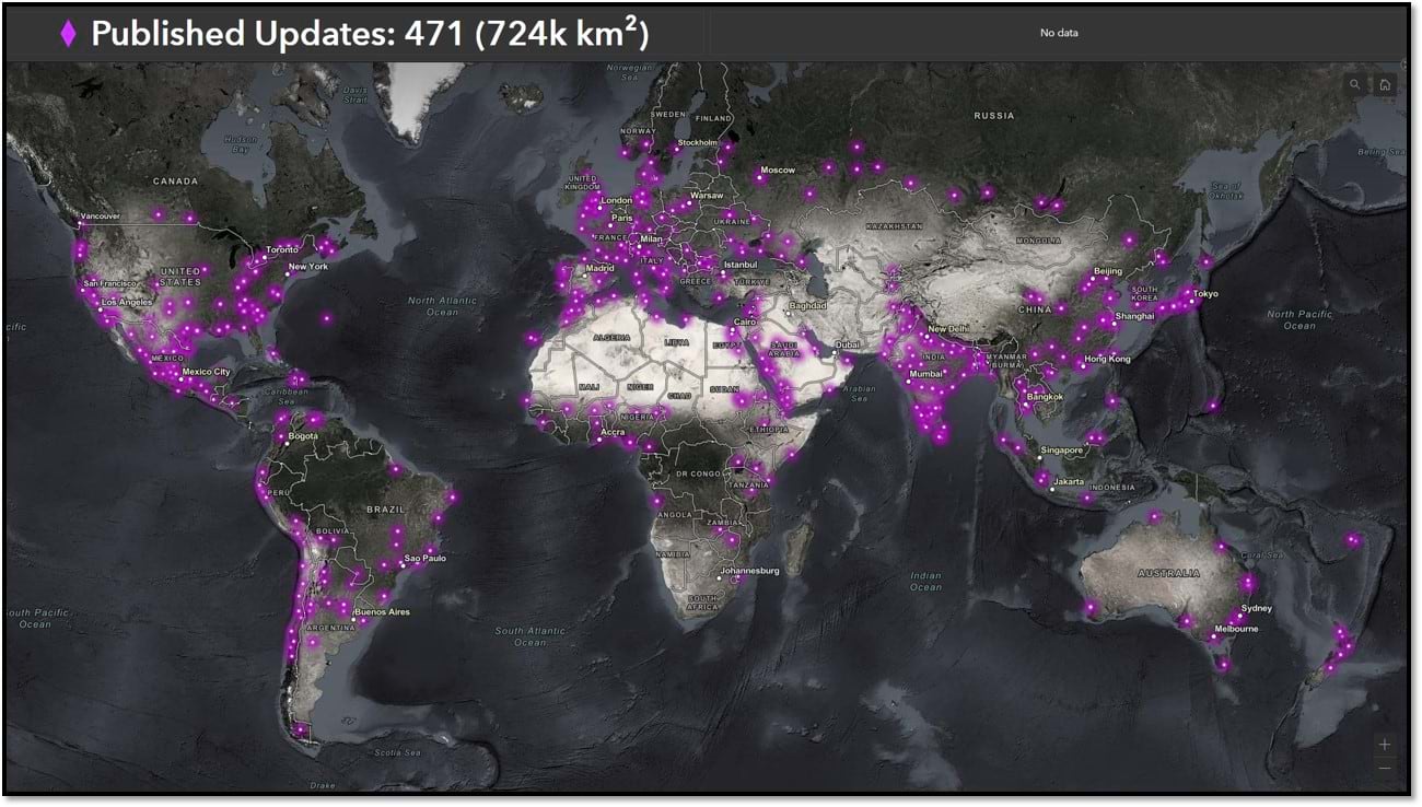 Year over year, we continue to enhance World Imagery with millions of square kilometers of imagery updates. This year, we are happy to announce that we are expanding our subscription with Maxar, upgrading more than 50M km² of existing regional coverage from 1.2-m to 60-cm resolution. For those keeping score, that’s 2x the spatial resolution and 4x the number of pixels, spanning more than 50M km². ![]()